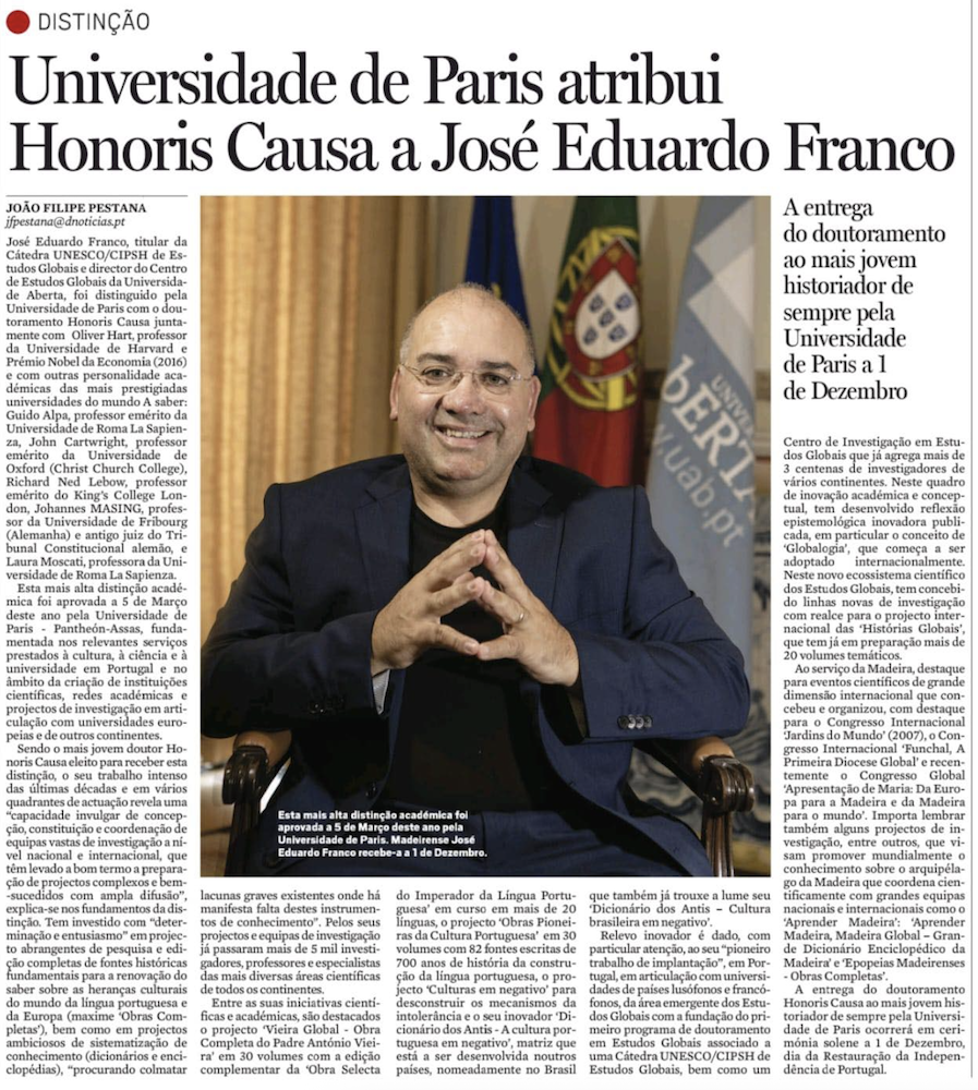 José Eduardo Franco, Investigador-Coordenador da Universidade Aberta e titular da Cátedra UNESCO/CIPSH de Estudos Globais e Diretor do Centro de Estudos Globais da Universidade Aberta, foi distinguido pela Universidade de Pari Pantheón-Assas com o Doutoramento Honoris Causa, sendo o mais jovem historiador de sempre a recebê-lo por esta instituição.