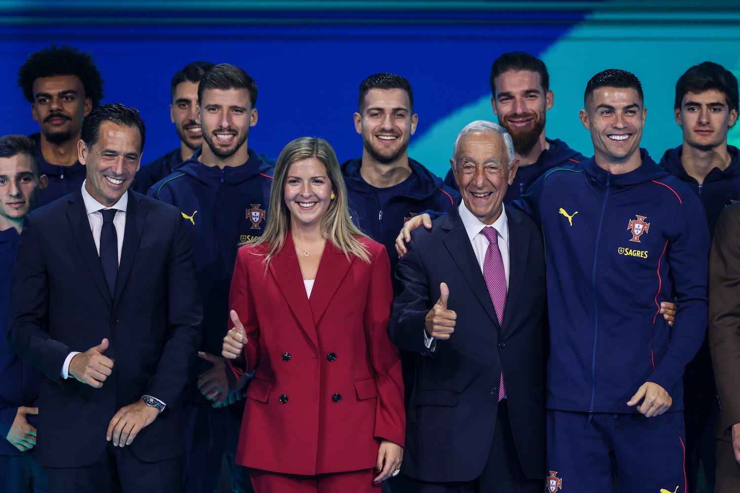 O Presidente da República, Marcelo Rebelo de Sousa (C), ladeado por Cristiano Ronaldo (C-D), por Pedro Proença (C-E), presidente da Federação Portuguesa de Futebol (FPF), e por Margarida Balseiro Lopes, ministra da Cultura, Juventude e Desporto, durante a cerimónia de abertura da Football Summit, cimeira internacional organizada pela FPF na Cidade do Futebol, em Oeiras, 8 de outubro de 2025.