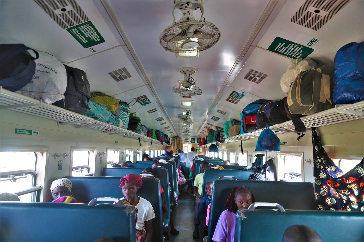 Depois da saída do centro de Maputo, o apito do comboio anuncia as paragens e há cada vez mais pessoas carregadas de mercadorias a entrar e a preencher os inúmeros espaços vazios nas carruagens de primeira à terceira classe.